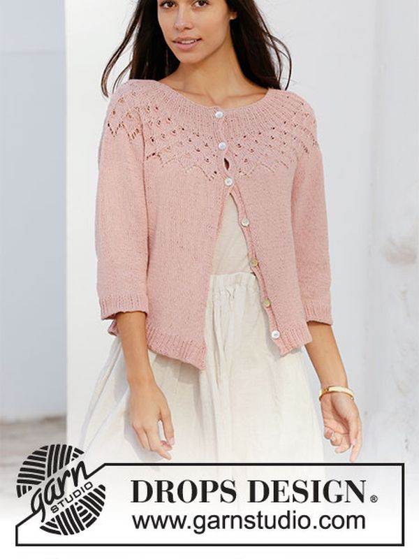 Diese charmante Baumwollstrickjacke wird von oben nach unten aus DROPS Safran gestrickt, hat eine runde Passe und ein hübsches rautenförmiges Lochmuster. Der Mittelteil der Jacke im klassischen durchgeknöpften Stil sowie die hübschen halblangen Ärmel werden glatt gestrickt mit gerippten Bündchen.