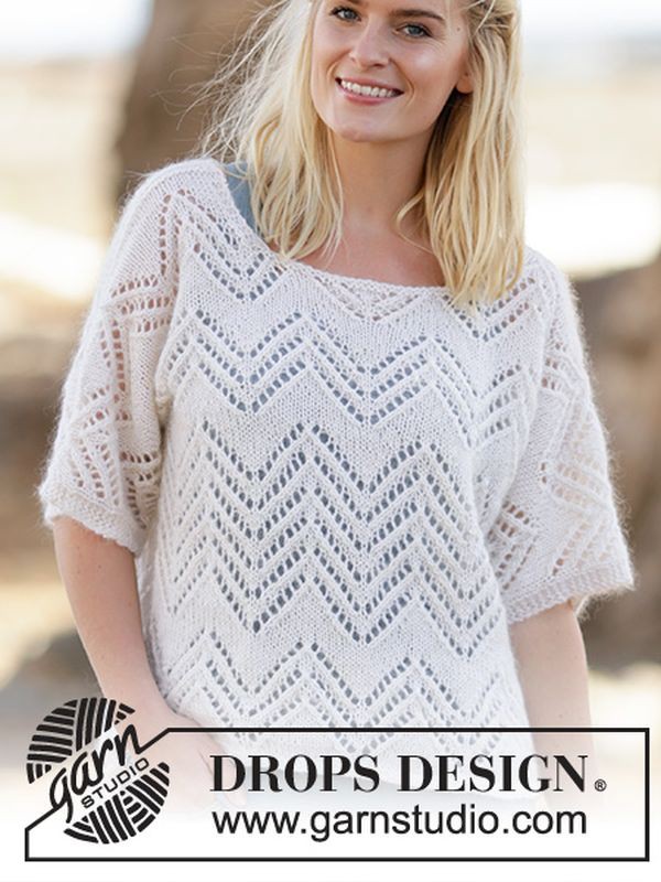 DROPS Strickanleitung für Always Ethereal, ein gerade geschnittenes Top mit Zickzack-Lochmuster und Details im Krausstrick aus je einem Faden DROPS Alpaca und Kid Silk. Dadurch entsteht ein herrliches Material mit weichem Faltenwurf und sanftem Flausch.