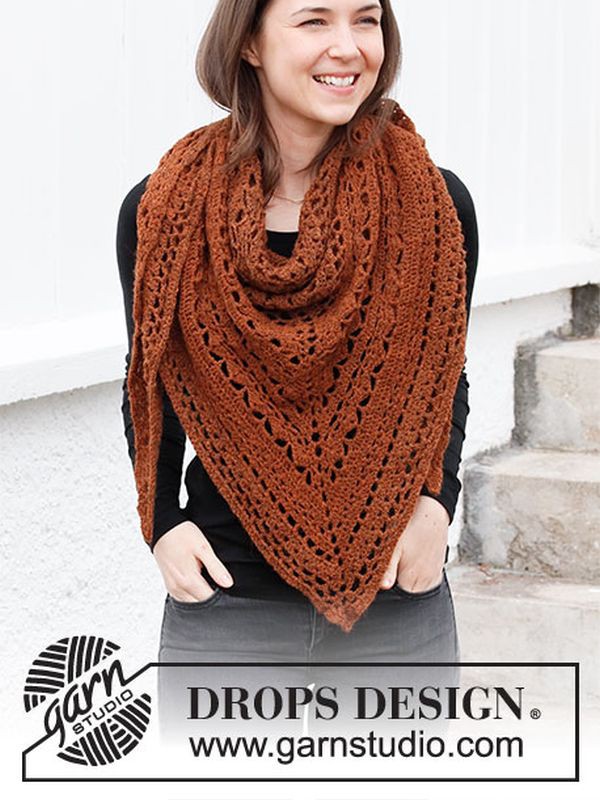 Dieses hübsche Schultertuch wird von oben (vom Hals aus) nach unten in einer Vielzahl verschiedener, modischer Lochmuster aus DROPS Sky gehäkelt. Das Tuch in klassischer Dreiecksform lässt sich auch prima als Schal, Umschlagtuch, Halstuch oder lässig über den Schultern tragen.