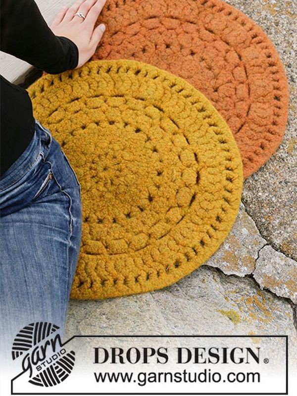 DROPS Häkelanleitung für Autumn Sun, eine ungewöhnliche Sitzmatte oder ein Sitzpolster aus DROPS Snow. Das Design wird im attraktiven Mandalastil gehäkelt und danach gefilzt, damit es gleichzeitig widerstandsfähig und doch weich ist.