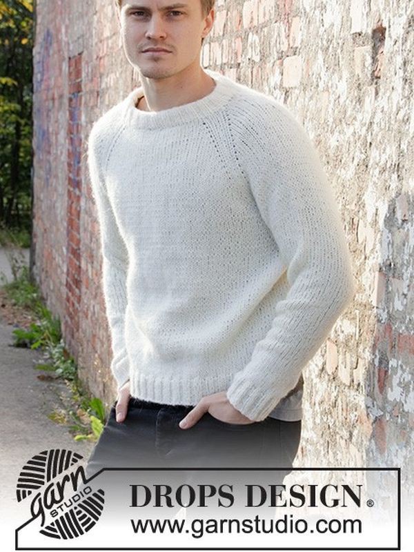 DROPS Strickanleitung für Carly, einen klassischen, legeren Raglanpullover in Herrengröße, glatt gestrickt mit gerippten Bündchen aus DROPS Air, einer superweichen, leichten Alpaka-Mischung in Aran-Qualität. Von oben nach unten rundgestrickt.