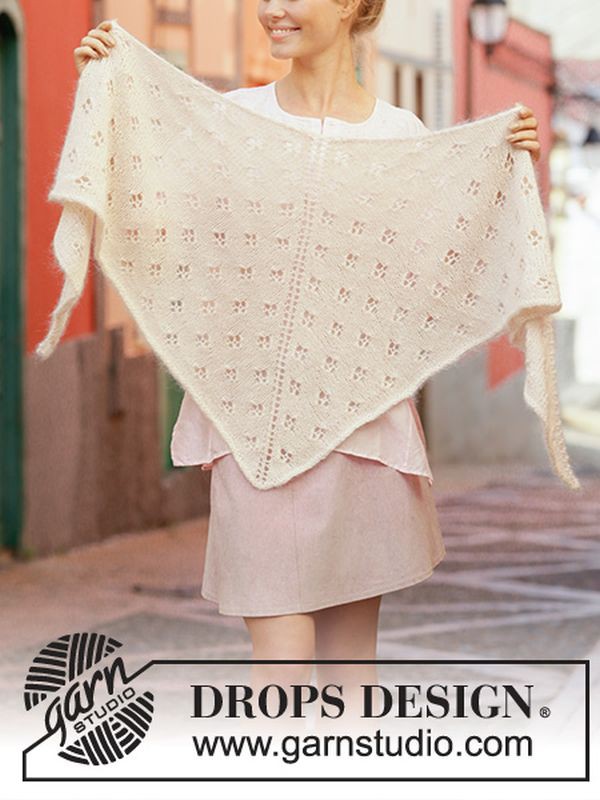 DROPS Strickanleitung für Ivory Dream, ein alltagstaugliches Schultertuch in klassischer Dreiecksform, das in schlichtem Lochmuster von oben nach unten aus je einem Faden DROPS Alpaca und Kid Silk gestrickt wird. So entsteht ein edles, weich fließendes Material mit sanftem Flausch.