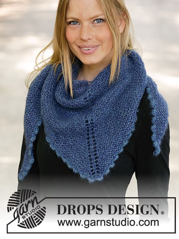 DROPS Strickanleitung für Midnight Hour, ein schlichtes, kraus gestricktes Schultertuch für jede Gelegenheit mit Picot-Borte und Lochmuster, das von der Mitte her mit zwei Fäden DROPS Kid Silk in zwei aufeinander abgestimmten Farbtönen gearbeitet wird. So entsteht ein wunderschön meliertes Material.
