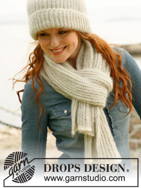 DROPS Strickanleitung für Nelly, einen Schal im Rippstrickmuster sowie einen Beanie, der sowohl salopp als auch mit umgeschlagener Krempe getragen werden kann. Beide Teile werden aus je einem Faden DROPS Alpaca und Kid Silk gestrickt, wodurch die Accessoires warm und kuschelig und doch gleichzeitig leicht und atmungsaktiv sind.