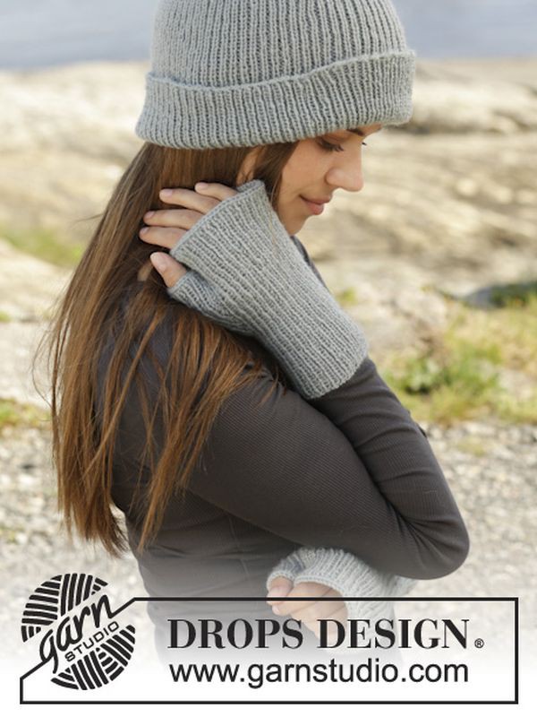 Dieses schlichte Set aus gerippter Hipster-Mütze und fingerlosen Fäustlingen wird aus DROPS Karisma gestrickt. Die Mütze kann salopp getragen werden oder mit umgeschlagener Krempe, damit sie enger anliegt. Sowohl Mütze als auch Fäustlinge werden von unten nach oben rund gestrickt.