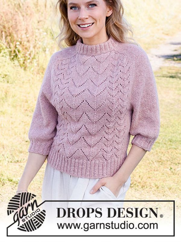 Dieser süße Pullover wird aus DROPS Sky gestrickt und besticht mit seinen zwei unterschiedlich großen Zickzack-Lochmusterelementen am Vorderteil. Er wird von oben nach unten gestrickt mit Sattelschultern, weiten, halblangen Ärmeln und umgeschlagenem Stehkragen. Der weiche, leichte Pink Sandstone wirkt am schönsten in hellen Pastell- oder Mitteltönen. Der raffinierte Look sieht sowohl in Kombination mit eleganter als auch mit lässiger Garderobe toll aus.