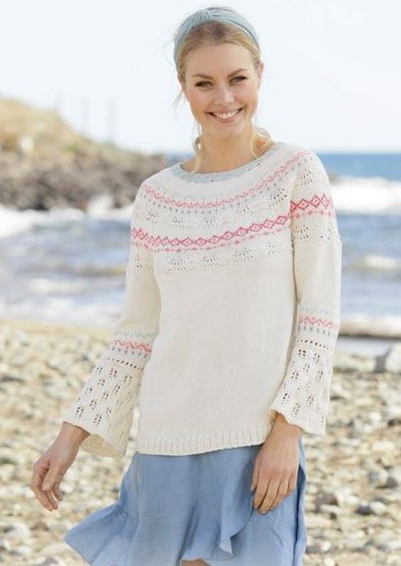 DROPS Strickanleitung für Relaxing in Reykjavik von DROPS Design, einen Pullover mit skandinavischem Farbmuster, Streifen in Fächer-Lochmuster, leicht gerüschten Lochmusterbündchen und kontrastfarbenem Halsausschnitt. Er wird von oben nach unten aus DROPS Safran gestrickt.
