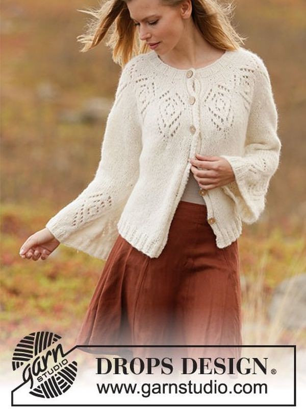 DROPS Strickanleitung für Tulip Ring, eine legere Strickjacke mit Passe und Ärmelabschlüssen im Lochmusterdesign, Trompetenärmeln, gerippten Bündchen und durchgehender Knopfleiste. Sie wird von oben nach unten mit runder Passe aus DROPS Air, einer superweichen, leichten Alpaka-Mischung in Aran-Qualität, rundgestrickt.