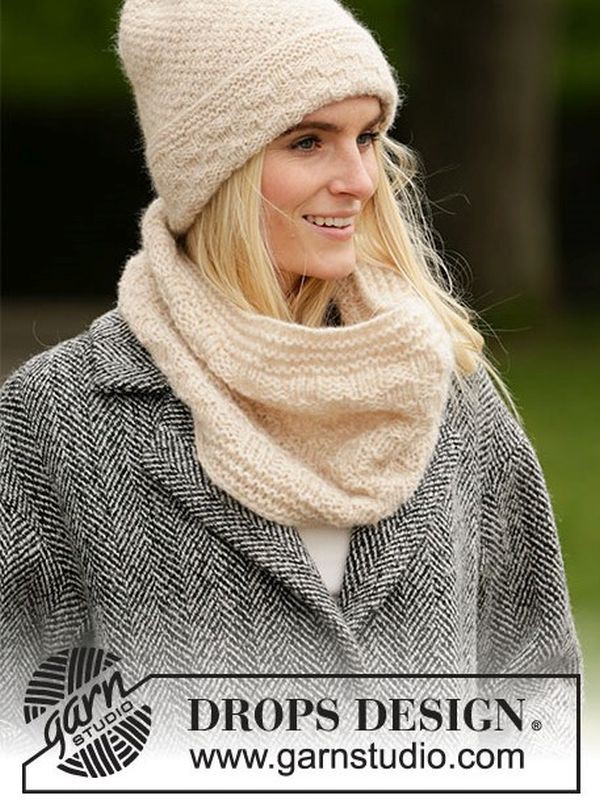 DROPS Strickanleitung für Weaving Memories, ein hübsches Set aus Mütze und Loopschal mit Web- und Krausstrickmuster aus DROPS Air, einer superweichen, leichten Alpaka-Mischung in Aran-Qualität. Sowohl die Mütze als auch der Loopschal werden rundgestrickt.