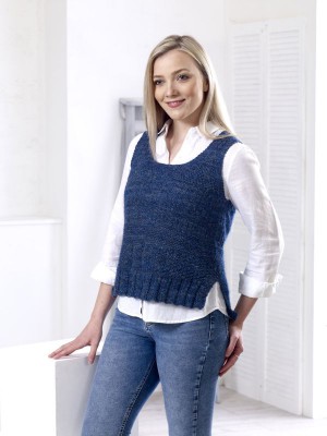 Strickanleitung für Gama, ein schickes Trägertop mit weitem Rundhalsausschnitt in klassischer Passform mit modischen Seitenschlitzen aus Manos del Uruguay Milo, einem elegant-rustikalen Mix aus weicher Merinowolle und feinstem Leinen. Das Trägertop mit seinen Blockstreifen aus schlichten Maschenmustern eignet sich prima für den Lagen-Look in der kälteren Jahreszeit, kombiniert mit Jeans und Stiefeln, sieht aber auch als Sommertop zusammen mit Shorts prima aus.