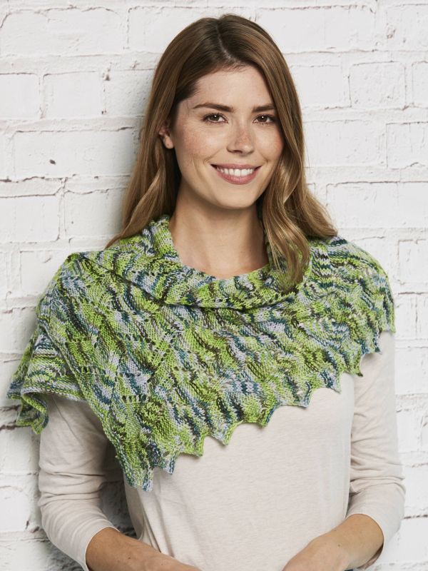 Kostenlose Strickanleitung für eine elegante rechteckige Stola mit Lochmuster und angedeuteten Zöpfen sowie Zickzack-Borte entlang einer Seite. Entworfen von Anniken Allis, der Königin der Lochmuster, aus Manos del Uruguay Alegria, einem wunderbaren, handgefärbten, fair gehandelten Garn in griffiger Qualität.