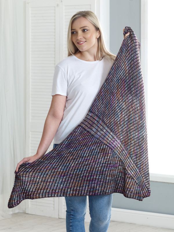 Strickanleitung von Manos del Uruguay für Pajaro von Rooster Yarns, ein wunderbar weiches, kuscheliges Dreieckstuch im Briochemuster mit einem Streifen in der Mitte aus Manos Silk Blend Fino, einer opulenten Mischung aus Seide und Merinowolle in einem luftigen einfädigen Garn, das von Hand gefärbt und fair gehandelt wird.
