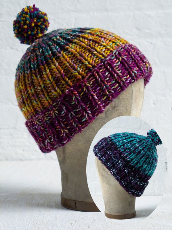 Manos del Uruguay Strickanleitung für die Mütze Simple Ribbed von Fairmount Fibers aus 100 g Manos Alegria Grande und Bocados Mini-Knäueln. Ein schlichter, gerippter Beanie im Colorblock-Design. Er wird mit doppeltem Faden rund gestrickt.