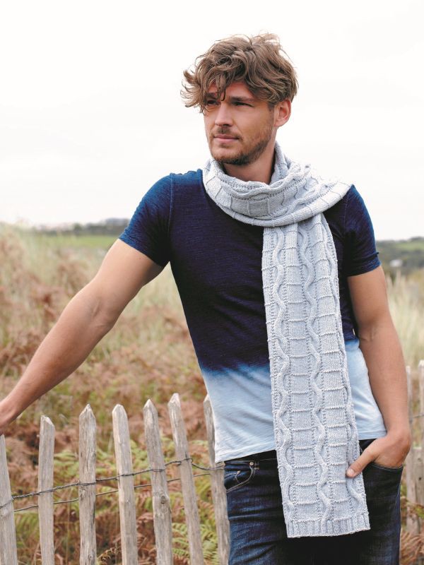 Strickanleitung für einen zum Pullover Dover passenden Schal aus der Kollektion Rowan Ocean Blue mit demselben Zickzack-Zopfmuster und Krausripp-Streifen. Das Design von Martin Storey wird aus Rowan Denim Revive gestrickt, einem recycelten Baumwollgarn in DK-Qualität.
