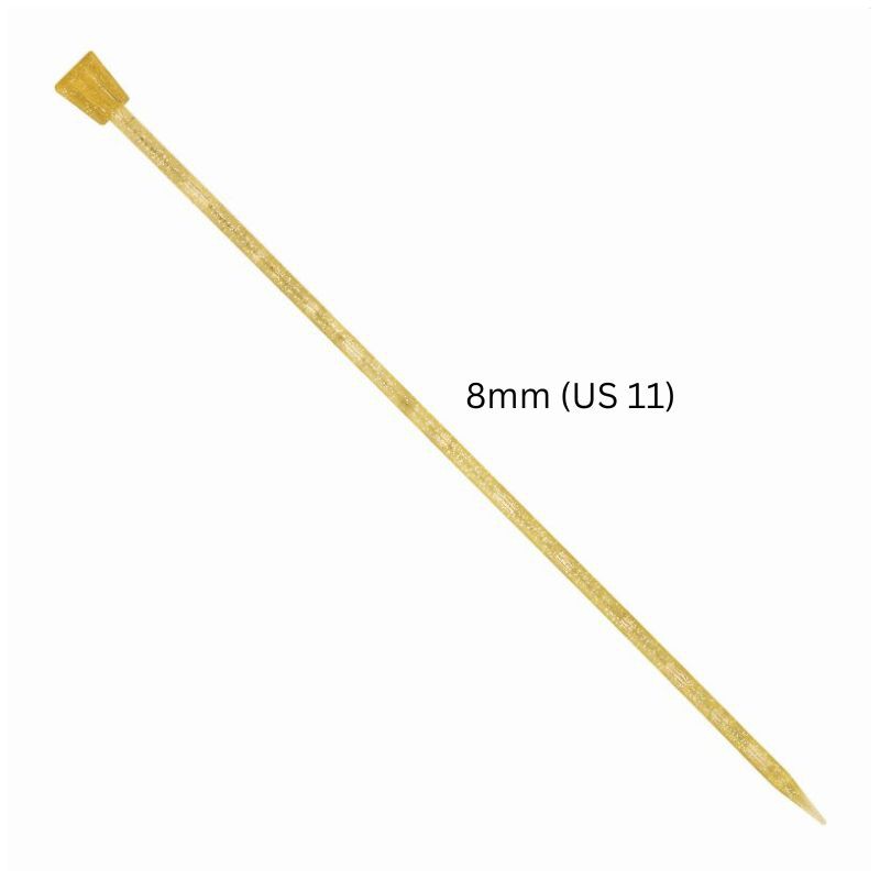 addi Jackenstricknadel aus Kunststoff mit Goldflitter in 35 cm Länge. Hochwertige, robuste, glatte Stricknadeln aus Kunststoff mit glitzerndem Goldflitter. Die Stärken 6-8 mm sind aus massivem Kunststoff mit Flitter, ab Stärke 9 mm bestehen die Nadeln aus einem hohlen, weißen Polymerkörper mit gold glitzernder Spitze.