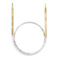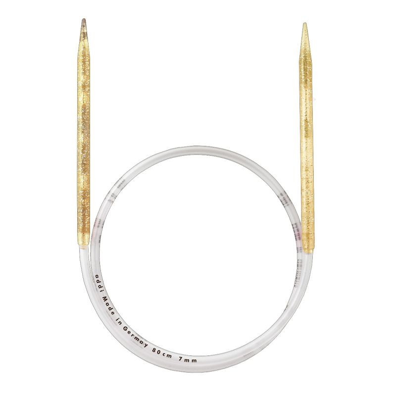 addi feste Rundstricknadel aus Kunststoff mit Goldflitter in 60 cm Länge. Aus hochwertigem, glattem Kunststoff mit glitzerndem Goldflitter und flexiblem Kunststoffseilen. Bei den Stärken 20 und 25 mm sind die Spitzen hohl, alle anderen Stärken sind massiv.