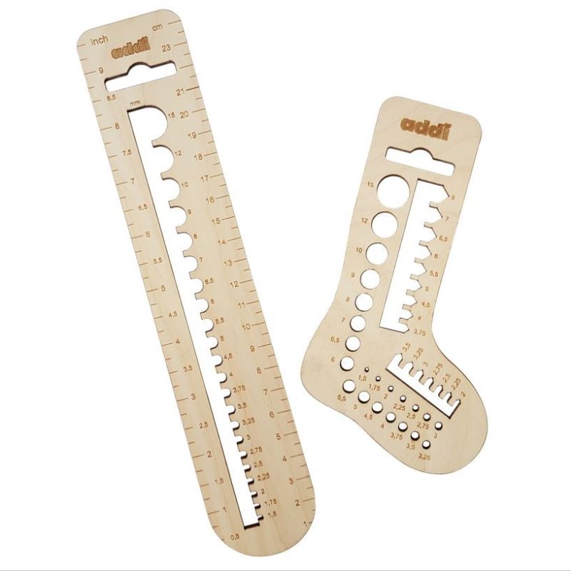 Unverzichtbares Zubehör zum Stricken und Häkeln: zwei praktische Holzlehren: eine sockenförmige zur Bestimmung der Stärke von Rundstricknadeln von 1,5 mm bis 15 mm sowie addi NOVEL Nadeln in den Stärken von 2 bis 8 mm. Die andere misst nicht nur die Stärke von Häkelnadeln, sondern dient auch als Lineal mit metrischen und Zollmaßen bis zu 24 cm (9,5 Zoll).
