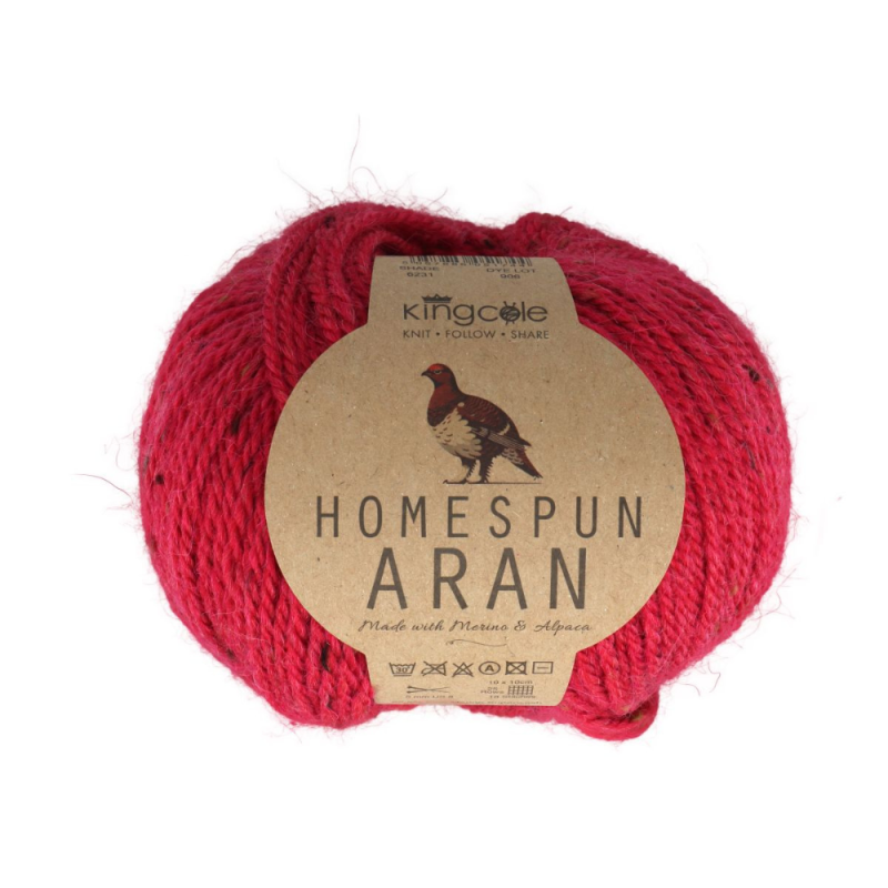 Als neues Mitglied der Homespun-Familie präsentiert Homespun Aran eine wollreiche Mischung aus 22,5 % feiner Merinowolle (Superwash), 22,5 % Alpaka, 30 % Acryl, 22,5 % Polyamid und 2,5 % Viskose. Die einfarbigen Töne dieses Garns erinnern an Waldspaziergänge und gemütliche Abende am Kamin. Homespun Aran ist ein wunderbar weiches Garn im Tweed-Stil mit einem unverkennbar rustikalen und behaglichen Charakter. Jeder Faden enthält feine Noppen, die für eine natürlich gesprenkelte, handgesponnen wirkende Optik sorgen. Die Farbpalette ist harmonisch aufeinander abgestimmt und basiert auf sanften, gedämpften Nuancen, die Wärme und Vertrautheit ausstrahlen.